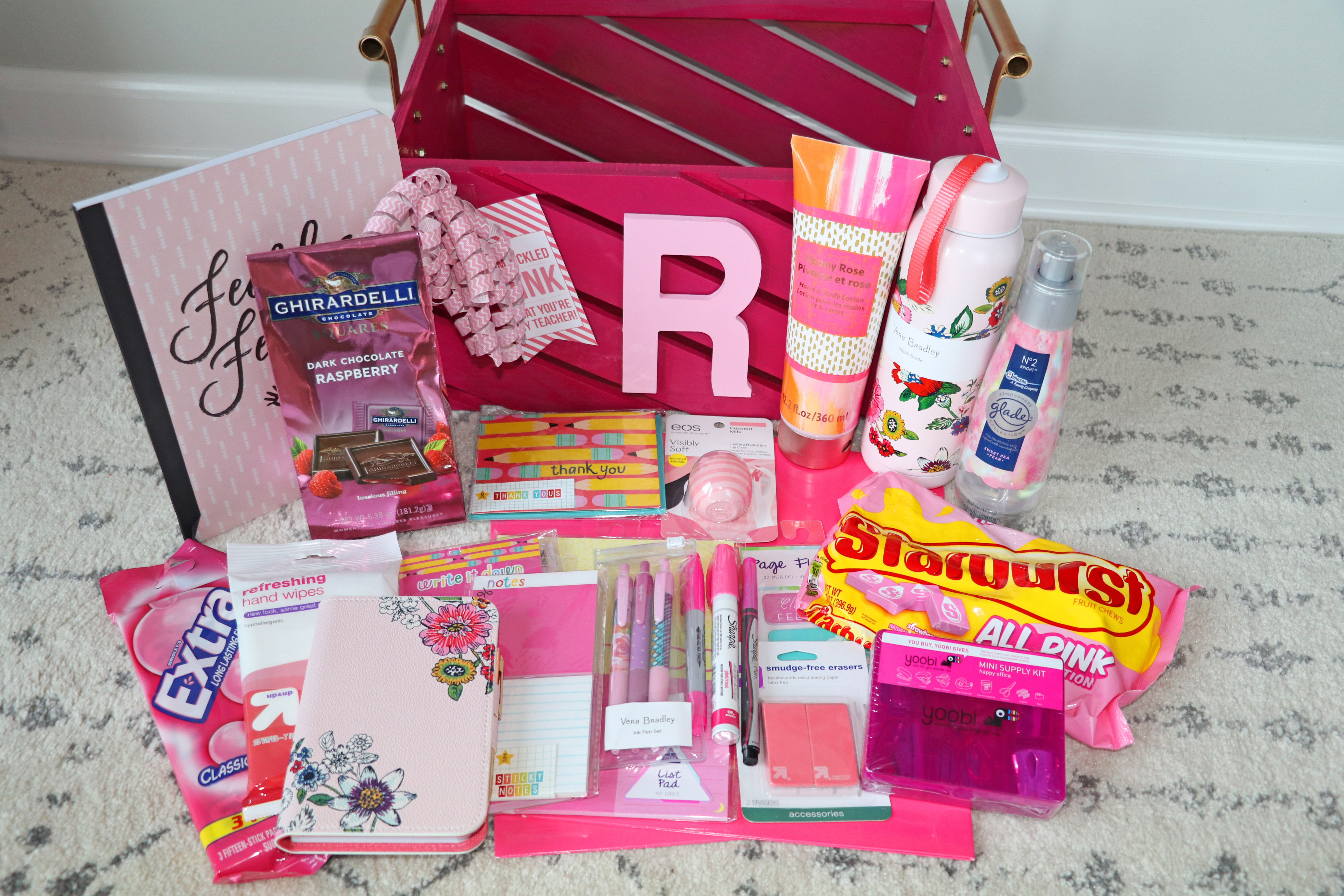 Because teachers need a little love too, why not show your appreciation and give them a cute little gift to start their year off right. We know that teachers spend a lot of their own money on school supplies so let’s help them out. Last year we made a bucket full of sunshine for the classrooms. The bucket was yellow and filled with all yellow school related items like clorox wipes, yellow post it notes, yellow highlighters, yellow folders and so on. You get the idea! This year we made “Tickled Pink To Have You as My Teacher’ crates. Pinterest once again has a ton of ideas too.