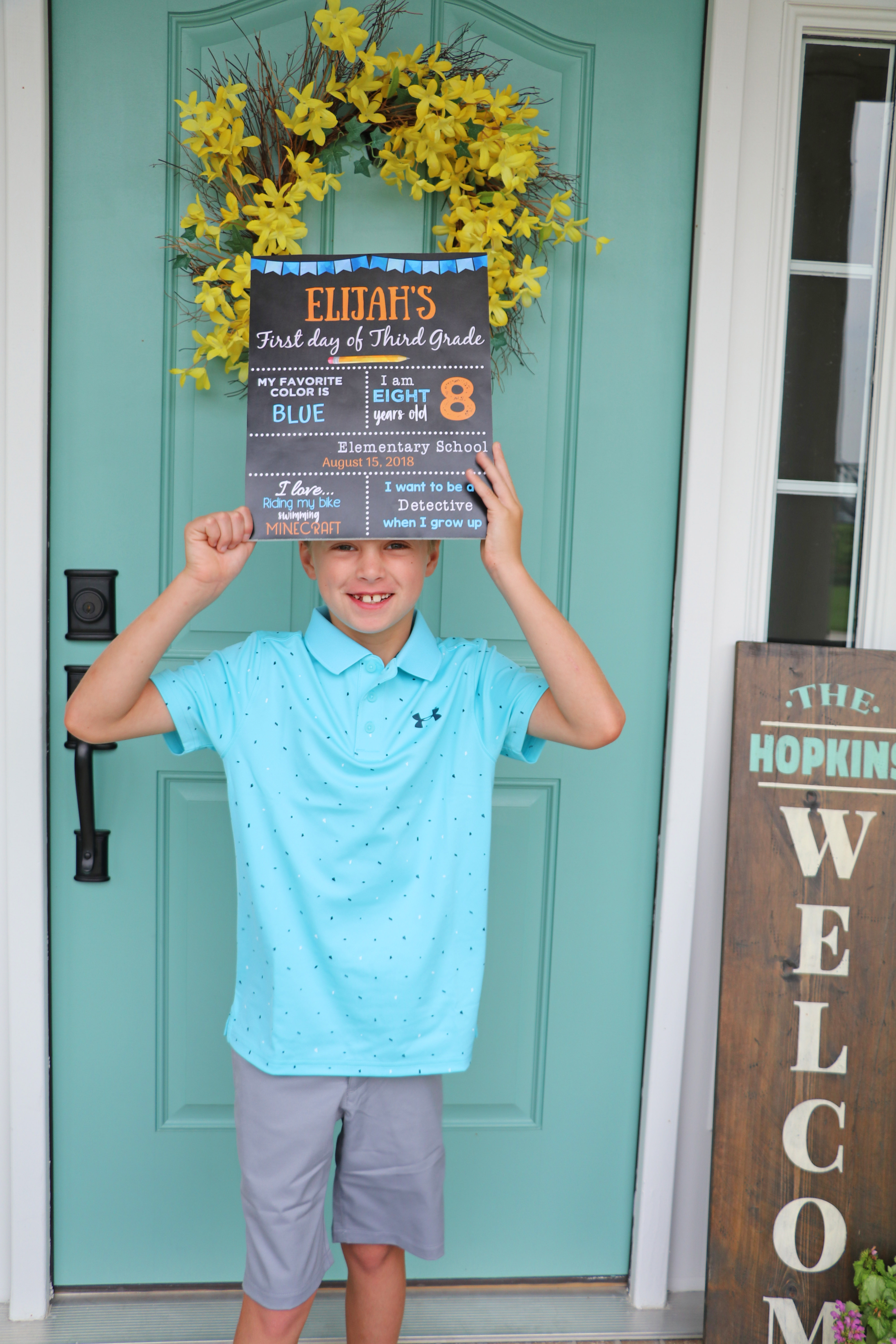 This one goes without saying. I mean really? Facebook and Instagram become inundated with these photos of our kids on the front stoop. Usually the kids are holding some sort of sign or chalkboard displaying the grade they are starting. My favorite place to purchase a pre-made or personalized sign is Etsy. Once I get the digital copy in email, I send it to the copy and print store to print in 8×10. To keep the sign from folding up in their hands, I mount the print to foam board. Super easy! Letter boards are also becoming popular too.