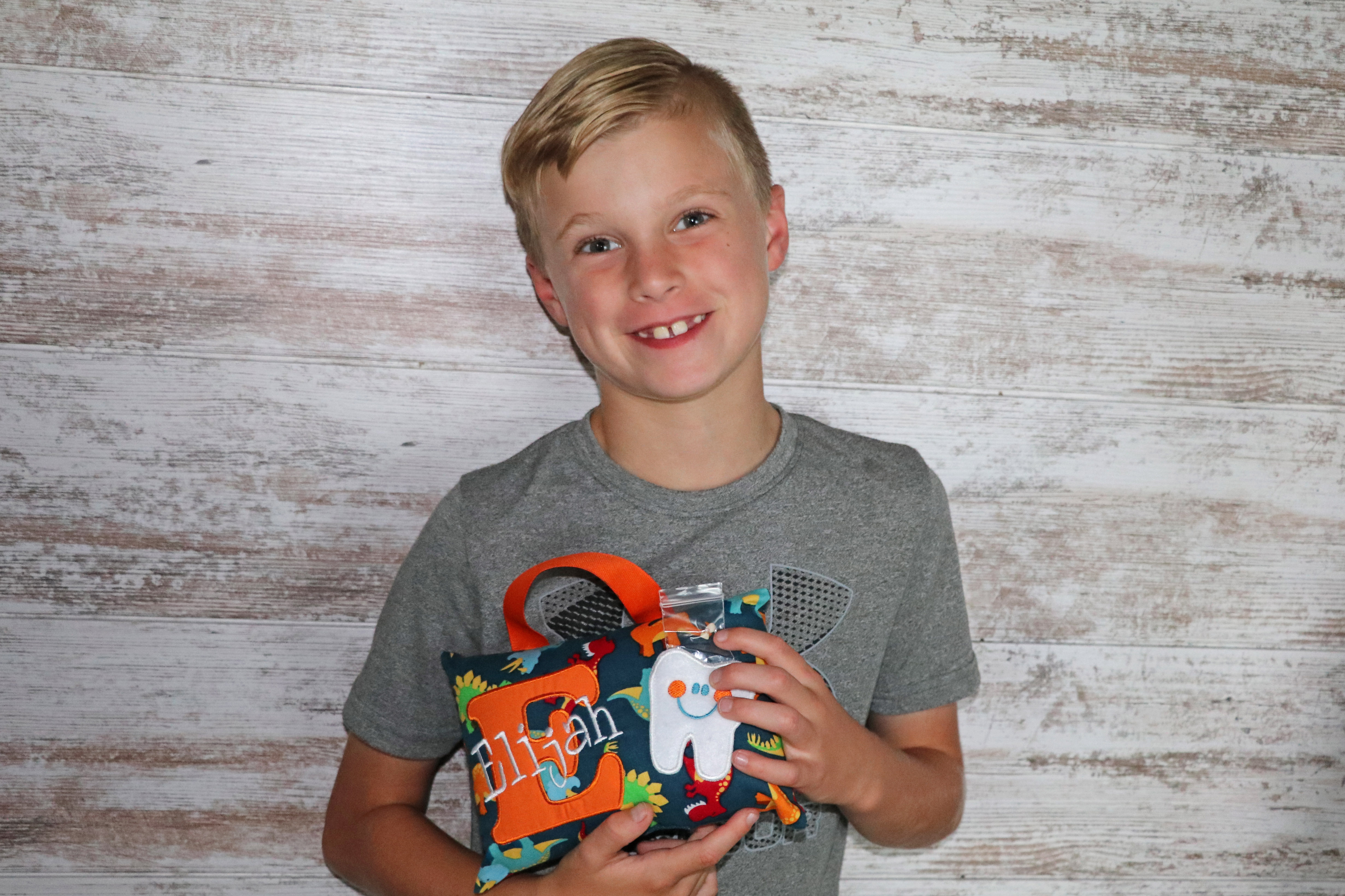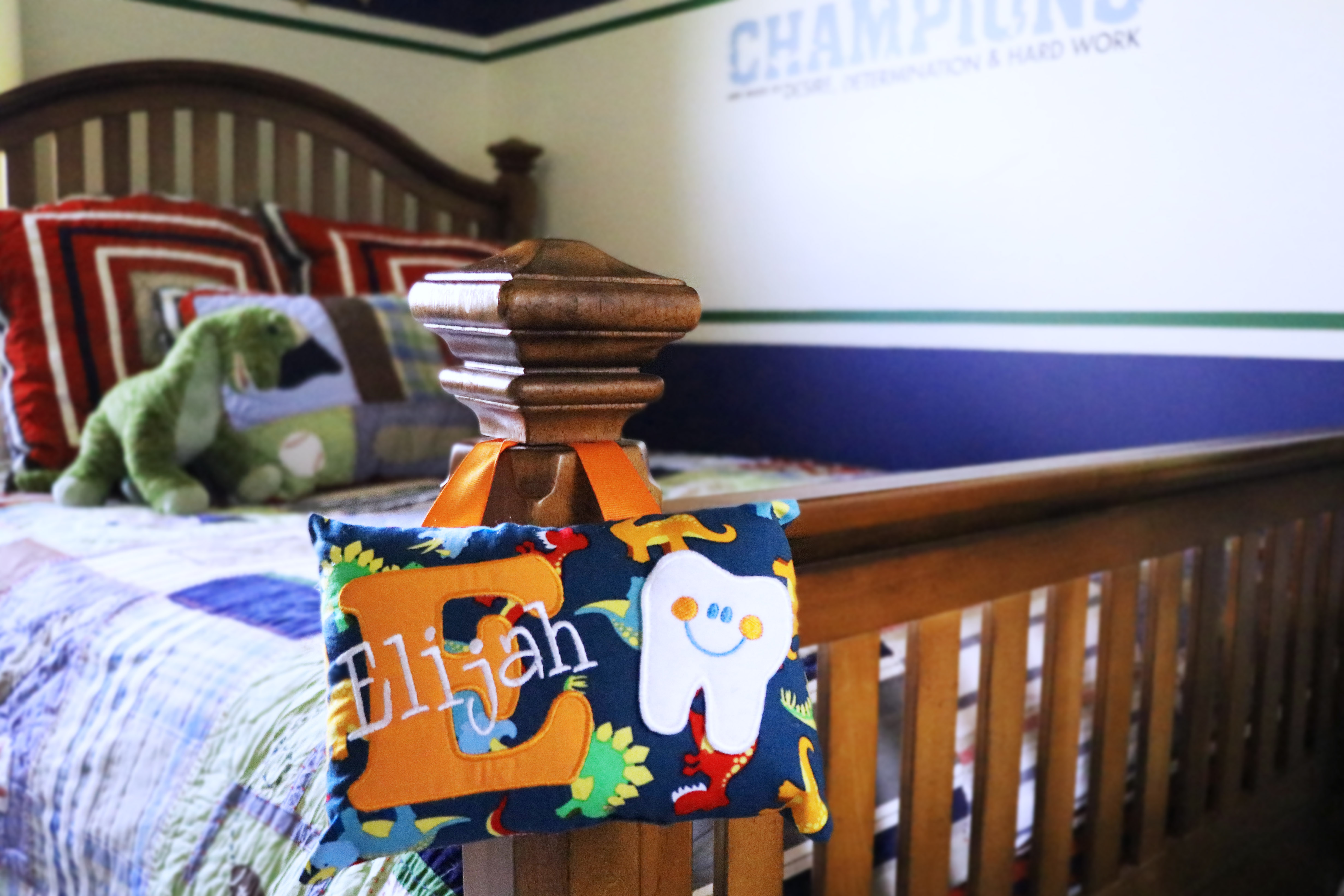 Looking back on it, I am amazed by how my parents managed to sneak in and out of my room without waking us up, especially since my sister and I shared a room. We tried super ninja moves in our oldest son’s room when he was little and it was nearly impossible to get in and out unheard. Once my husband slithered under the crib to avoid being seen. Oh how I wish our video baby monitors saved video back then. So, we wised up and found these cute little tooth fairy pillows to hang on their beds.