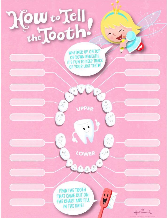Want a good way to keep track of your child’s lost teeth and get them engaged in dental health? Start a lost tooth chart. Here are a few color options for you to print from Hallmark. Ours were actually sewn onto the back of the tooth fairy pillow. You could also make a passport book to track the progress of their lost teeth.